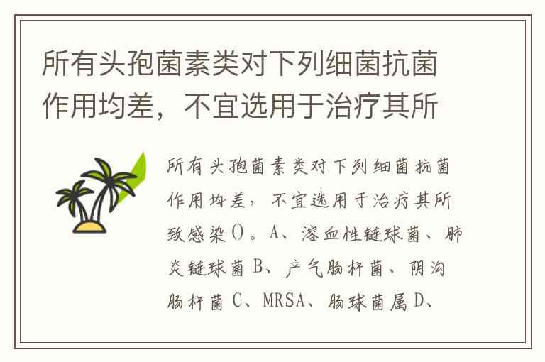 所有头孢菌素类对下列细菌抗菌作用均差,不宜选用于治疗其所致感染()。A、溶血性链球菌、肺炎链球菌 B、产气肠杆菌、阴沟肠杆菌 C、MRSA、肠球菌属 D、铜绿假单胞菌