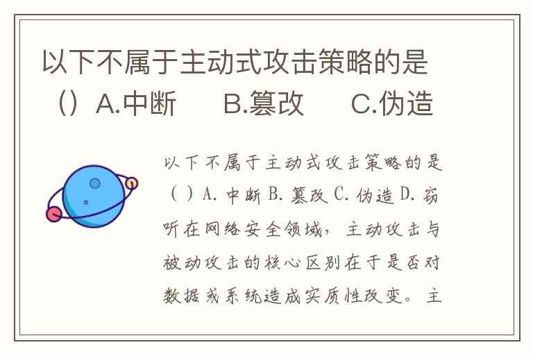 在网络安全领域,主动攻击与被动攻击的核心区别在于是否对数据或系统造成实质性改变。主动攻击如同“强盗闯入”,通过篡改、中断或伪造数据直接破坏系统完整性、可用性或真实性;而被动攻击更像“间谍窃听”,仅秘密收集信息而不干扰正常通信。题目中不属于主动式攻击策略的是 D.窃听。
