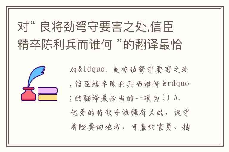 对“ 良将劲弩守要害之处,信臣精卒陈利兵而谁何 ”的翻译最恰当的一项为( ) A. 优秀的将领手执强有力的,扼守着险要的地方,可靠的官员、精锐的士卒,握着锋利的武器,盘问过往的行人。 B. 优秀的将领用力拿着,扼守着险要的地方,可靠的官员、精锐的士卒,握着锋利的武器,呵斥过往的行人。 C. 优秀的将领手执强有力的,扼守着险要的地方,可靠的官员、精锐的士卒握着武器,呵斥过往的行人。 D. 优秀的将领用力拿着,扼守着险要的地方,可靠的官员、精锐的士卒,缉查盘问过往的行人。