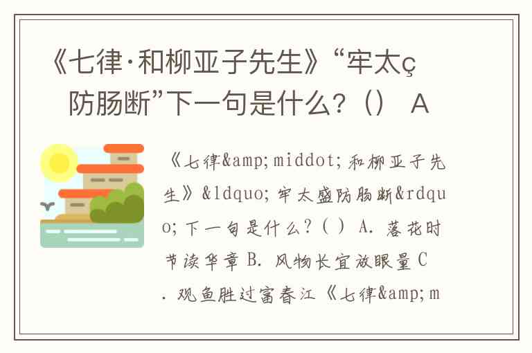 《七律·和柳亚子先生》“牢太盛防肠断”下一句是什么?() A. 落花时节读华章 B. 风物长宜放眼量 C. 观鱼胜过富春江