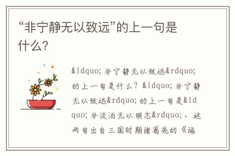 “非宁静无以致远”的上一句是“非淡泊无以明志”,这两句出自三国时期诸葛亮的《诫子书》,是流传千古的修身格言。作为诸葛亮写给儿子诸葛瞻的家书,这句话浓缩了他对人生的深刻思考——唯有看淡世俗名利,才能明确内心志向;唯有保持内心宁静,才能实现长远目标。