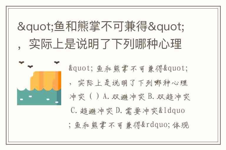 “鱼和熊掌不可兼得”体现的是双趋冲突(答案选B)。这种心理冲突指的是当同时存在两个具有同等吸引力的目标,却只能选择其中一个时产生的矛盾状态。