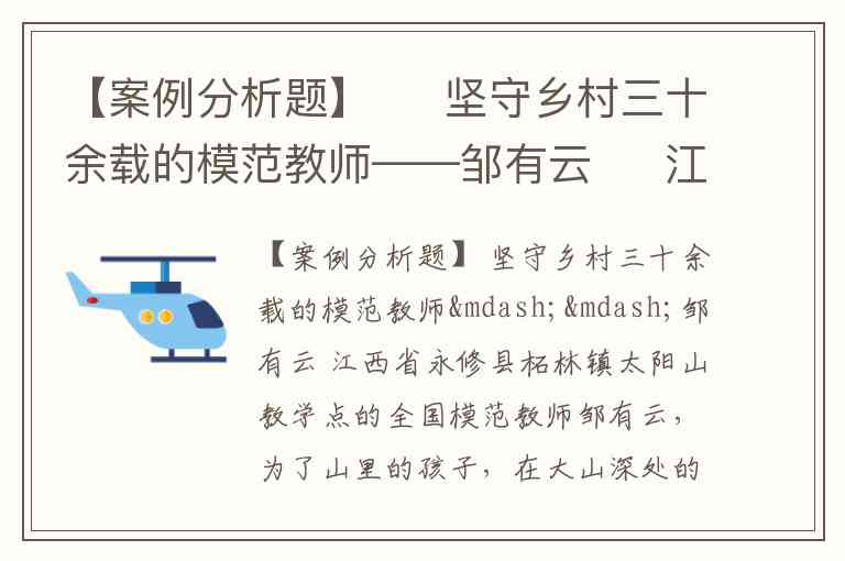 【案例分析题】 坚守乡村三十余载的模范教师——邹有云 江西省永修县柘林镇太阳山教学点的全国模范教师邹有云,为了山里的孩子,在大山深处的三尺讲台上坚守三十余年,默默奉献,取得非凡的教学业绩。 1974年,邹老师离开村小,来到大山深处的太阳山教学点,开始了三十多年的一校一师的教学生涯。在学校里他既是老师、校长,又是爸爸、炊事员、维修工,除了要完成四个年级全部课程的复式教学,还要负责孩子的接送、用餐、行为习惯培养等工作。 教学点开办初期只有12名学生,在他的挨家串户劝说下和无偿资助下,许多贫困家庭的孩子(尤其是女孩)都有了上学的机会,学生增至40余人,该上学的一个都不少。 三十多年,邹老师为山里孩子倾注了全部心血,帮助其树立远大的理想,教给其知识,养成其良好的行为习惯,他认真钻研探索复式教学规律,充分发挥小助手作用和学生主动性,学生的成绩多次在全镇名列前茅,教学质量得到了专家和社会的一致好评。至今教学点的孩子已有二十多人先后上了大学,成为国家的栋梁。 当问及邹老师何以能坚守乡村教学岗位三十余年时,他说图的就是知识能改变山区的面貌,为了山区孩子有好的前程,为了自己能当个好老师。 请根据所给案例材料,试分析邹老师身上体现出的爱岗敬业精神。说明自己的观点和认识,理论运用要恰当,逻辑阐述要清楚、观点陈述要明确、字数不少于400字。A.教育能力 B.教学能力 C.研究能力 D.反思能力