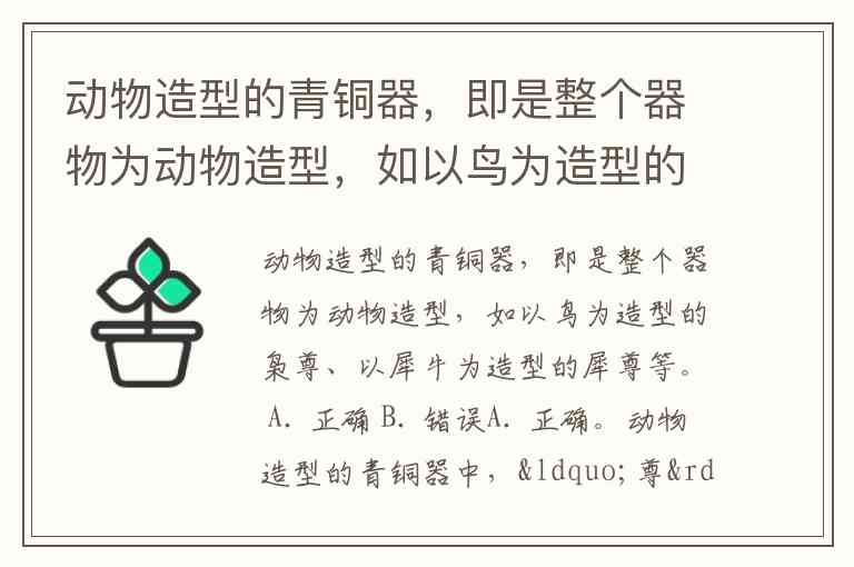 动物造型的青铜器,即是整个器物为动物造型,如以鸟为造型的枭尊、以犀牛为造型的犀尊等。 A. 正确 B. 错误