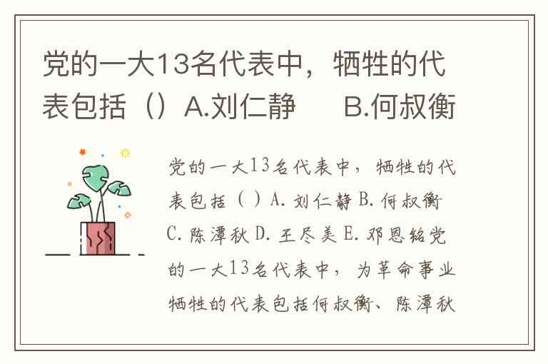 党的一大13名代表中,牺牲的代表包括()A.刘仁静 B.何叔衡 C.陈潭秋 D.王尽美 E.邓恩铭