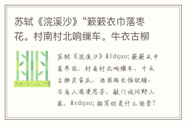 苏轼《浣溪沙》“簌簌衣巾落枣花。村南村北响缫车。牛衣古柳卖黄瓜。酒困路长惟欲睡,日高人渴漫思茶。敲门试问野人家。”描写的是什么场景? A. 歌舞场景 B. 出猎场景 C. 乡村场景 D. 战争场景