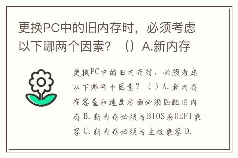 更换PC中的旧内存时,必须考虑以下哪两个因素?()A.新内存在容量和速度方面必须匹配旧内存 B.新内存必须与BIOS或UEFI兼容 C.新内存必须与主板兼容 D.电源必须提供新内存所需的电压 E.芯片组必须支持新内存的速度
