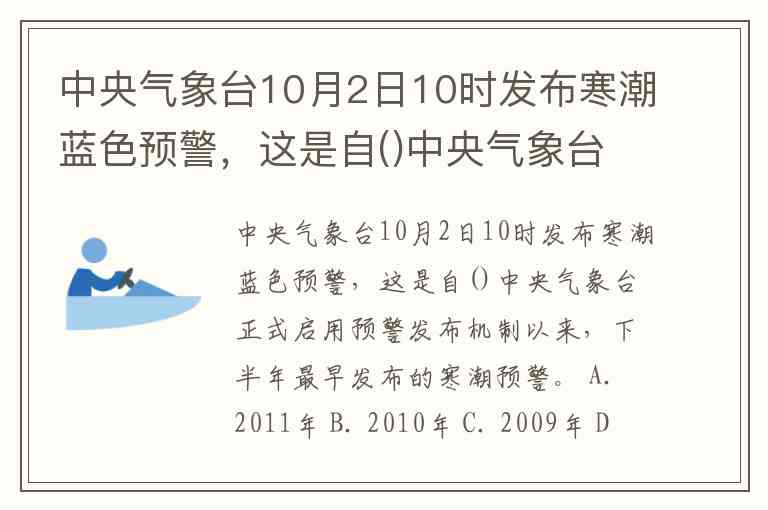 中央气象台10月2日10时发布寒潮蓝色预警,这是自()中央气象台正式启用预警发布机制以来,下半年最早发布的寒潮预警。 A. 2011年 B. 2010年 C. 2009年 D. 2008年