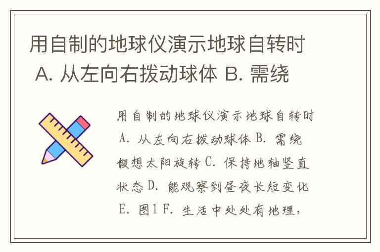 用自制的地球仪演示地球自转时 A. 从左向右拨动球体 B. 需绕假想太阳旋转 C. 保持地轴竖直状态 D. 能观察到昼夜长短变化 E. 图1 F. 生活中处处有地理,图2是我国第五套人民币 50 元面值背面,主景为布达拉宫。 读图,完成3~5 题。 G. 图2
