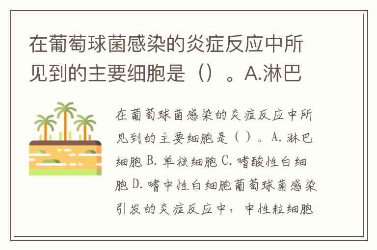 在葡萄球菌感染的炎症反应中所见到的主要细胞是()。A.淋巴细胞 B.单核细胞 C.嗜酸性白细胞 D.嗜中性白细胞