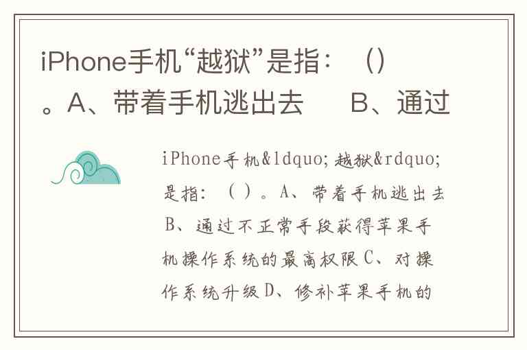 正确答案:B、通过不正常手段获得苹果手机操作系统的最高权限