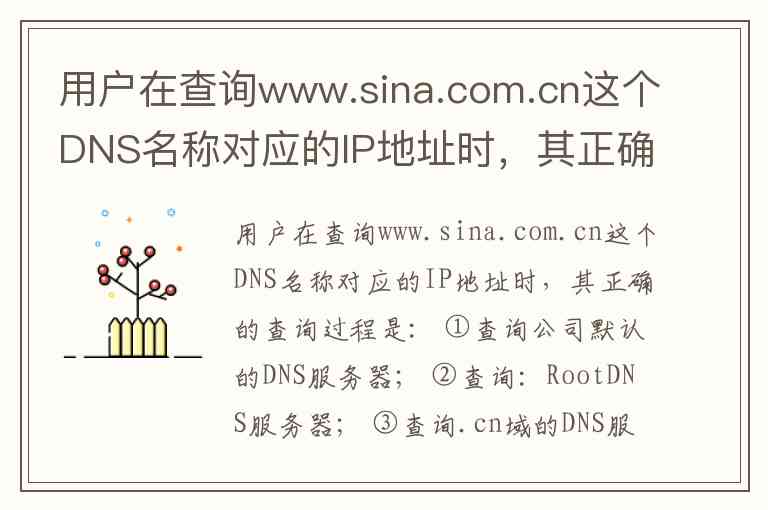 用户在查询www.sina.com.cn这个DNS名称对应的IP地址时,其正确的查询过程是: ①查询公司默认的DNS服务器; ②查询:RootDNS服务器; ③查询.cn域的DNS服务器; ④查询com.cn域的DNS服务器; ⑤查询sina.com.cn域的DNS服务器。()A.①②③④⑤ B.①③④⑤② C.①⑤ D.⑤④③②①