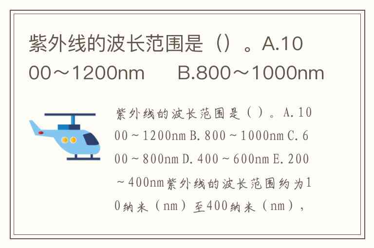 紫外线的波长范围是()。A.1000~1200nm B.800~1000nm C.600~800nm D.400~600nm E.200~400nm