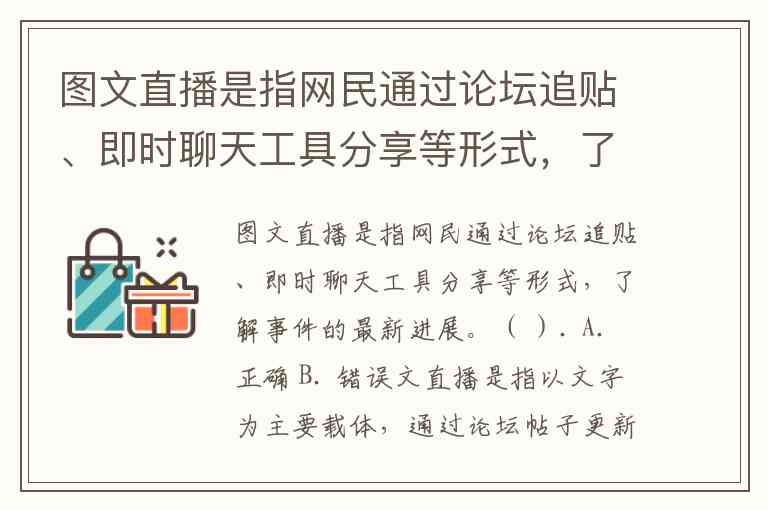 图文直播是指网民通过论坛追贴、即时聊天工具分享等形式,了解事件的最新进展。( ). A. 正确 B. 错误