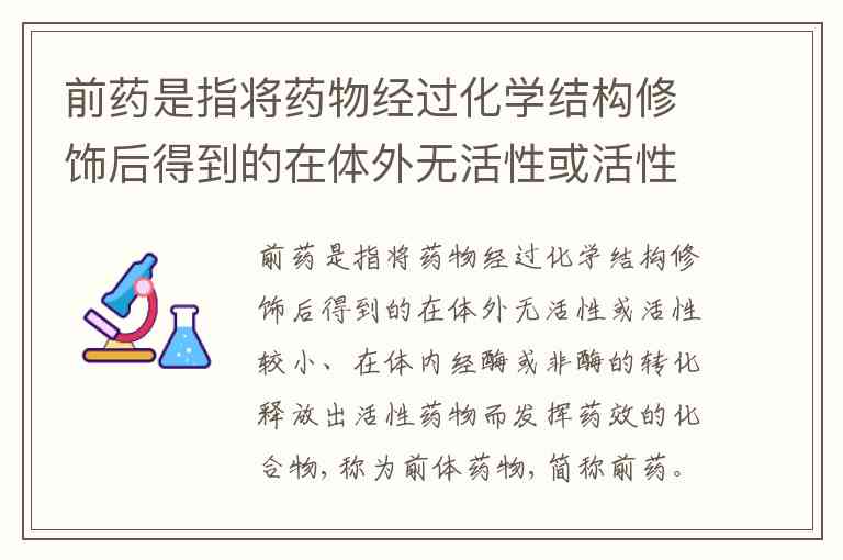 前药的经典例子包括阿司匹林(体内转化为水杨酸)和环磷酰胺(经肝脏代谢激活),这些案例均验证了题干定义的科学性。这一概念体现了药物设计中“潜伏活性”与“靶向释放”的智慧平衡。