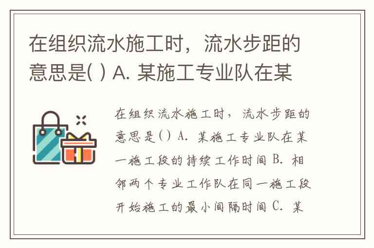 在组织流水施工时,流水步距的意思是( ) A. 某施工专业队在某一施工段的持续工作时间 B. 相邻两个专业工作队在同一施工段开始施工的最小间隔时间 C. 某施工专业队在单位时间内完成的工程量 D. 某施工专业队在某一施工段进行施工的活动空间
