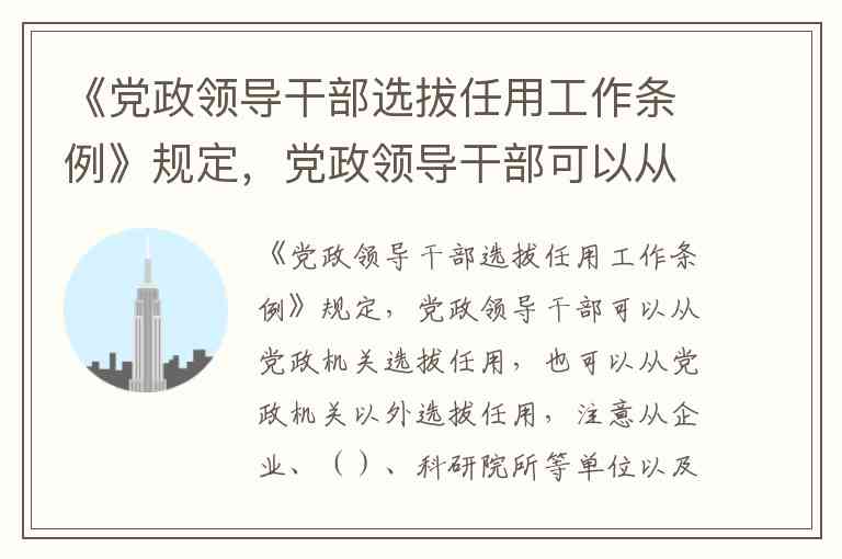 《党政领导干部选拔任用工作条例》明确规定,选拔党政领导干部需拓宽视野和渠道,除党政机关外,应注意从企业、高等学校、科研院所等单位以及社会组织中发现选拔。这一表述在2022年以来的多个权威版本中保持一致,例如2025年8月修订版和2024年7月版本均强调了"高等学校"作为关键选拔渠道之一。