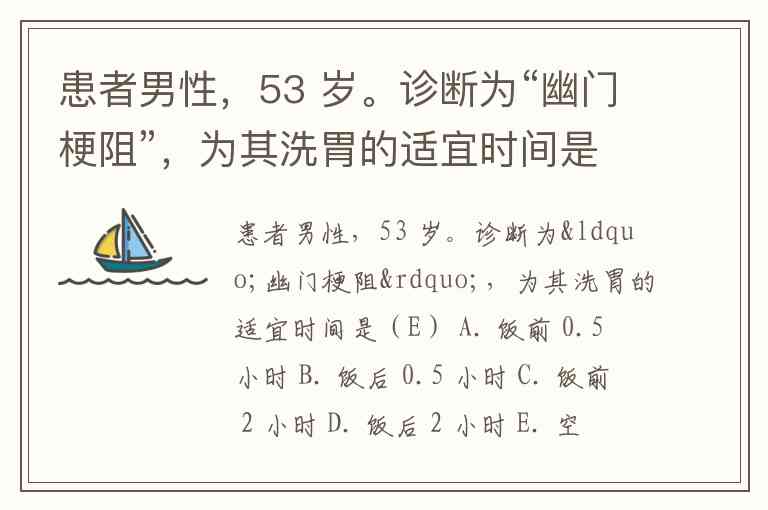 患者男性,53 岁。诊断为“幽门梗阻”,为其洗胃的适宜时间是(E) A. 饭前 0.5 小时 B. 饭后 0.5 小时 C. 饭前 2 小时 D. 饭后 2 小时 E. 空腹时