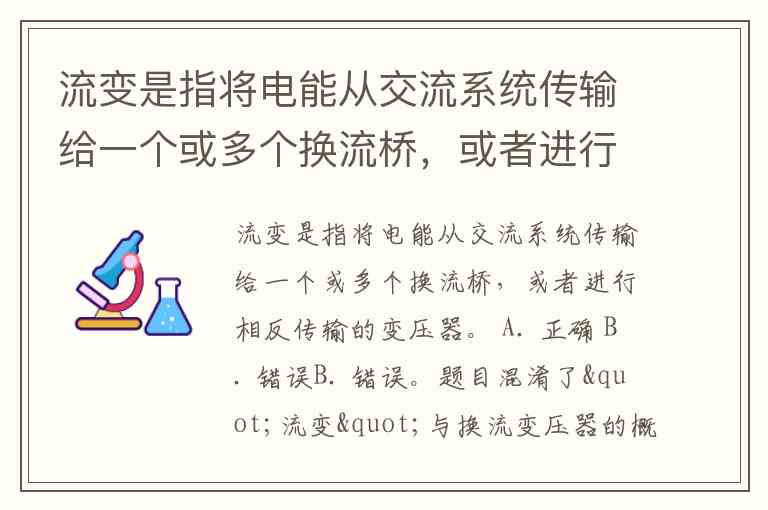 B. 错误。题目混淆了"流变"与换流变压器的概念。根据定义,换流变压器是连接换流桥与交流系统的电力变压器,主要功能是为换流桥提供换相电压并实现电气隔离。它与换流阀配合才能完成交直流电能转换,是直流输电工程的"心脏"设备。而"流变"通常指电流互感器,是用于电流测量的设备,二者功能截然不同。题目描述实际指向的是换流变压器的作用,但名称表述错误。