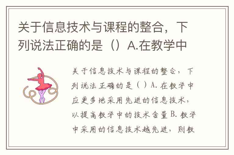 关于信息技术与课程的整合,下列说法正确的是()A.在教学中应更多地采用先进的信息技术,以提高教学中的技术含量 B.教学中采用的信息技术越先进,则教学效果越好 C.根据教学内容选择合适的技术,才能有效地发挥信息技术的作用 D.信息技术能解决教学中的所有问题
