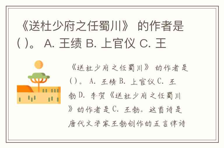 《送杜少府之任蜀川》 的作者是( )。 A. 王绩 B. 上官仪 C. 王勃 D. 李贺