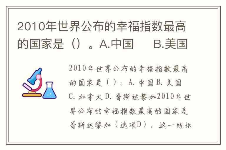 2010年世界公布的幸福指数最高的国家是哥斯达黎加(选项D)。这一结论基于盖洛普世界民意调查在2005至2009年间对155个国家及地区的调查结果,该调查通过“人生评估”和“每日体验”两项指标综合评分。在“生活如意者”百分比排名中,哥斯达黎加以63%的占比并列第六,但其“日常生活感受”评分达到8.1分,超过丹麦(7.9分)、芬兰(7.8分)等北欧国家,展现出居民对日常情绪体验的高度满意度。