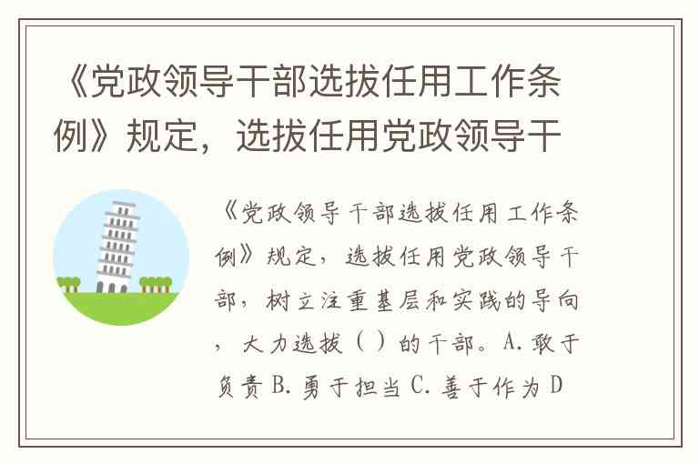 《党政领导干部选拔任用工作条例》明确规定,选拔任用党政领导干部时需树立注重基层和实践的导向,大力选拔敢于负责、勇于担当、善于作为、实绩突出的干部。这一表述在不同时期发布的条例文本中保持高度一致,体现了干部选拔标准的稳定性和连续性。