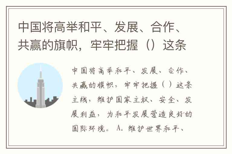 中国将高举和平、发展、合作、共赢的旗帜,牢牢把握()这条主线,维护国家主权、安全、发展利益,为和平发展营造良好的国际环境。 A. 维护世界和平、促进共同发展 B. 坚定不移走和平发展道路 C. 坚持和平发展、促进民族复兴 D. 构建以合作共赢为核心的新型国际关系