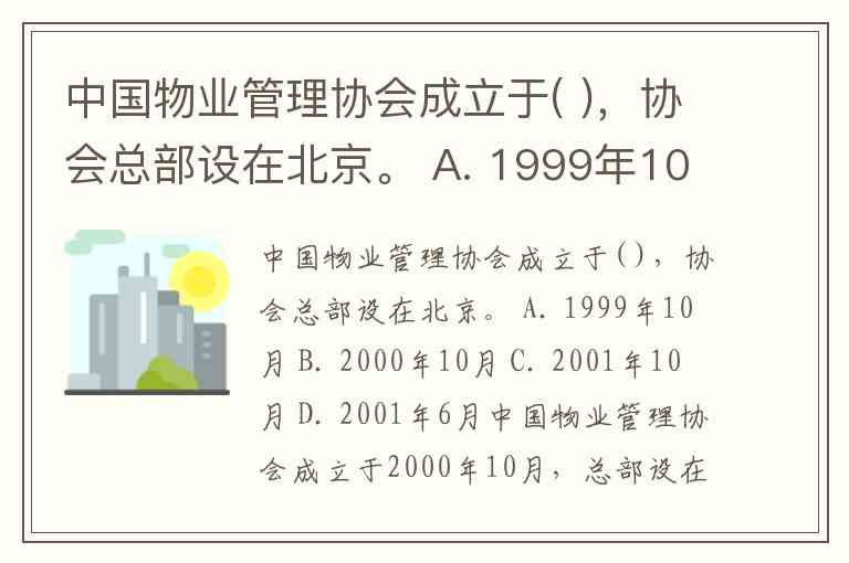 中国物业管理协会成立于( ),协会总部设在北京。 A. 1999年10月 B. 2000年10月 C. 2001年10月 D. 2001年6月
