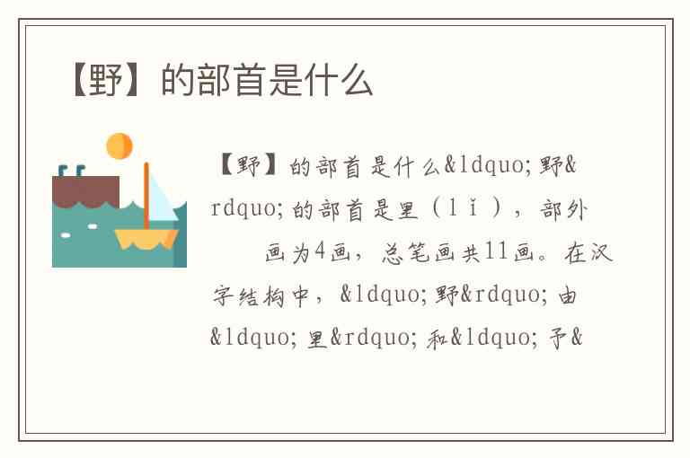 “野”的部首是里(lǐ),部外笔画为4画,总笔画共11画。在汉字结构中,“野”由“里”和“予”组成,其中“里”作为形旁,与字的意义范畴相关,本义指郊外、离城市较远的地方,后引申为不受约束、非驯养等含义。