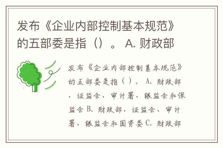 发布《企业内部控制基本规范》的五部委是指()。 A. 财政部、证监会、审计署、银监会和保监会 B. 财政部、证监会、审计署、银监会和国资委 C. 财政部、证监会、审计署、国资委和保监会 D. 财政部、证监会、国资委、银监会和保监会