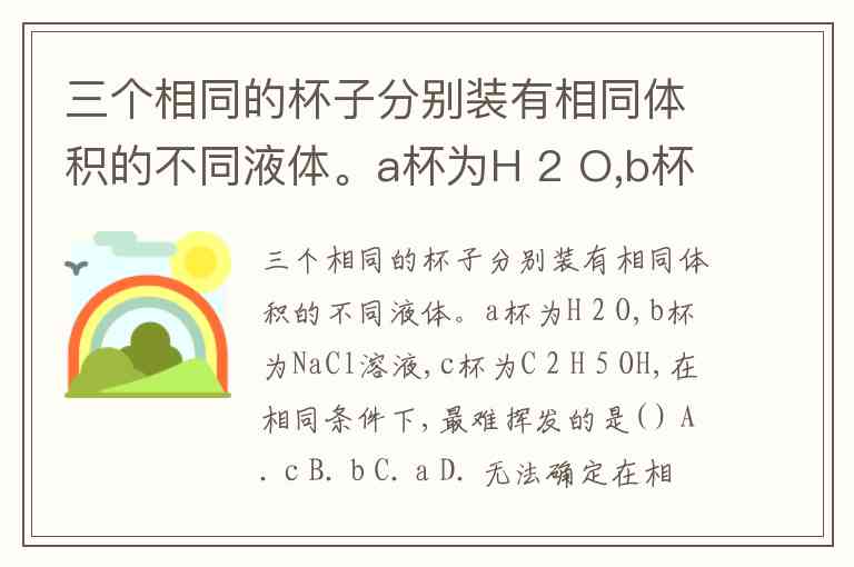 三个相同的杯子分别装有相同体积的不同液体。a杯为H 2 O,b杯为NaCl溶液,c杯为C 2 H 5 OH,在相同条件下,最难挥发的是( ) A. c B. b C. a D. 无法确定