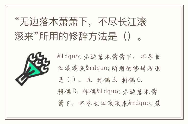 “无边落木萧萧下,不尽长江滚滚来”所用的修辞方法是()。 A. 对偶 B. 排偶 C. 骈偶 D. 律偶