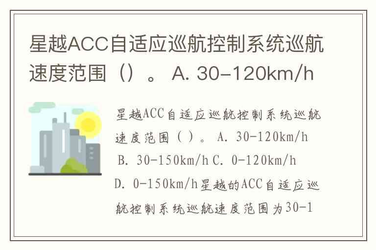 星越ACC自适应巡航控制系统巡航速度范围()。 A. 30-120km/h B. 30-150km/h C. 0-120km/h D. 0-150km/h