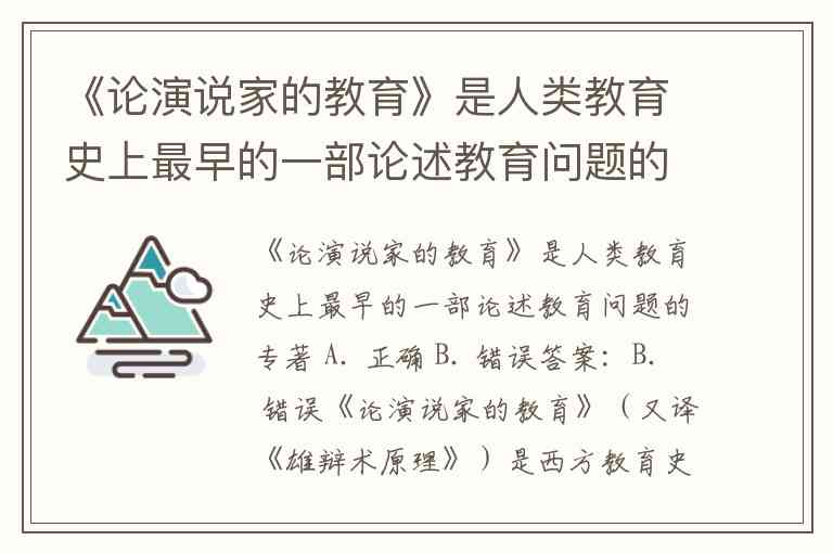 《论演说家的教育》是人类教育史上最早的一部论述教育问题的专著 A. 正确 B. 错误