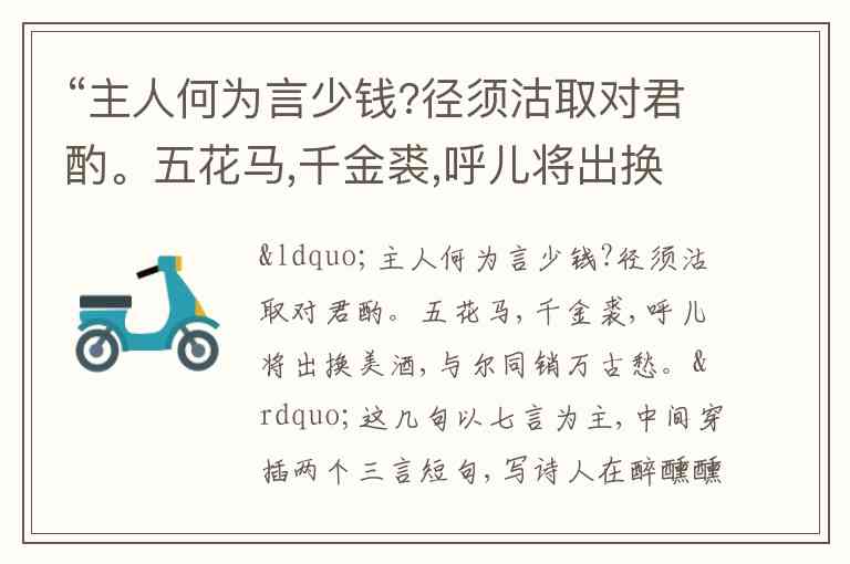 “主人何为言少钱?径须沽取对君酌。五花马,千金裘,呼儿将出换美酒,与尔同销万古愁。”出自李白《将进酒》,这几句以七言为主,中间穿插“五花马,千金裘”两个三言短句,形成节奏变化。诗句表现的是诗人豪饮时的狂放不羁,主动提出用名贵物品换酒,体现出超越世俗物欲的豪迈气概,而非“反客为主吆喝主人”的失礼行为。这种解读误解了李白诗歌中“狂放”的精神内涵与盛唐文人的豪情特质。