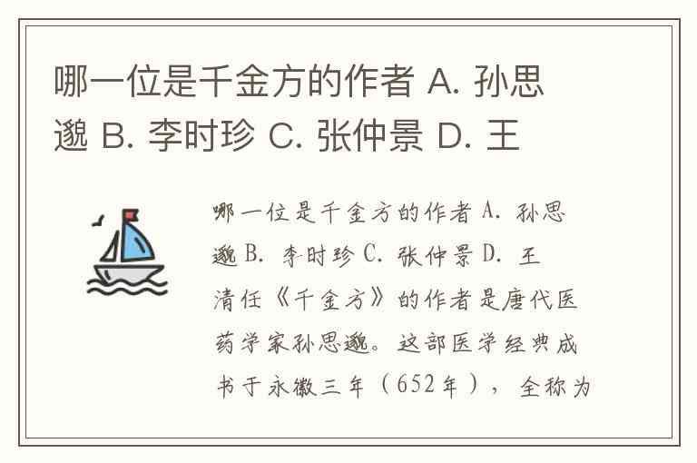 哪一位是千金方的作者 A. 孙思邈 B. 李时珍 C. 张仲景 D. 王清任