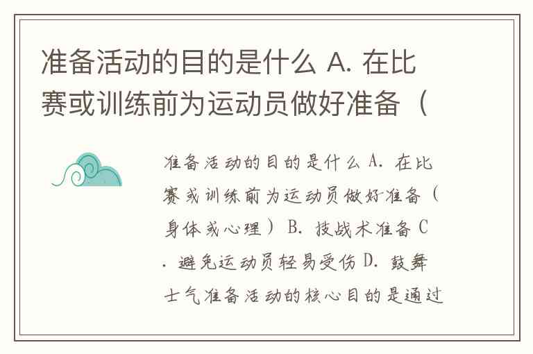 准备活动的目的是什么 A. 在比赛或训练前为运动员做好准备(身体或心理) B. 技战术准备 C. 避免运动员轻易受伤 D. 鼓舞士气