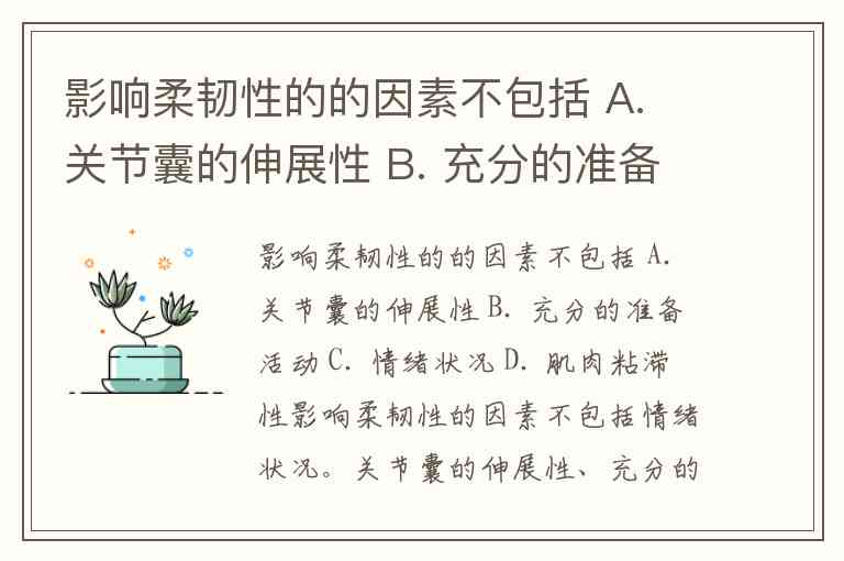 影响柔韧性的的因素不包括 A. 关节囊的伸展性 B. 充分的准备活动 C. 情绪状况 D. 肌肉粘滞性