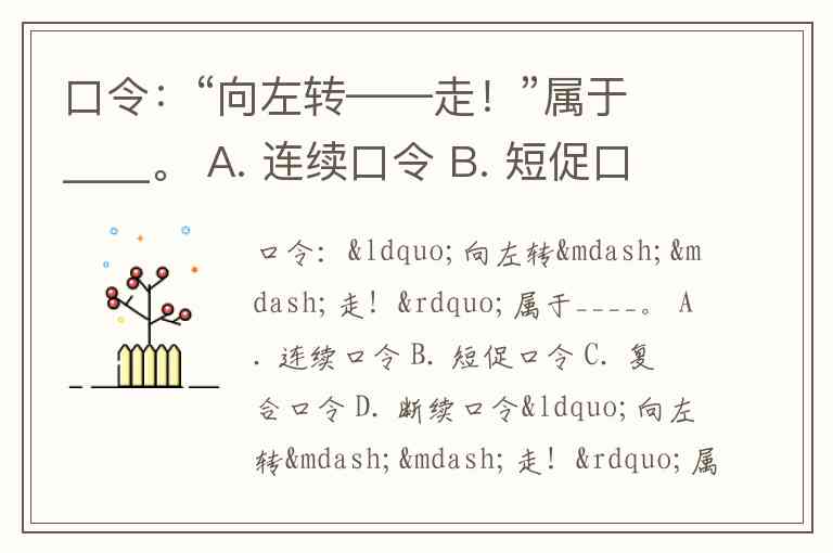 口令:“向左转——走!”属于____。 A. 连续口令 B. 短促口令 C. 复合口令 D. 断续口令