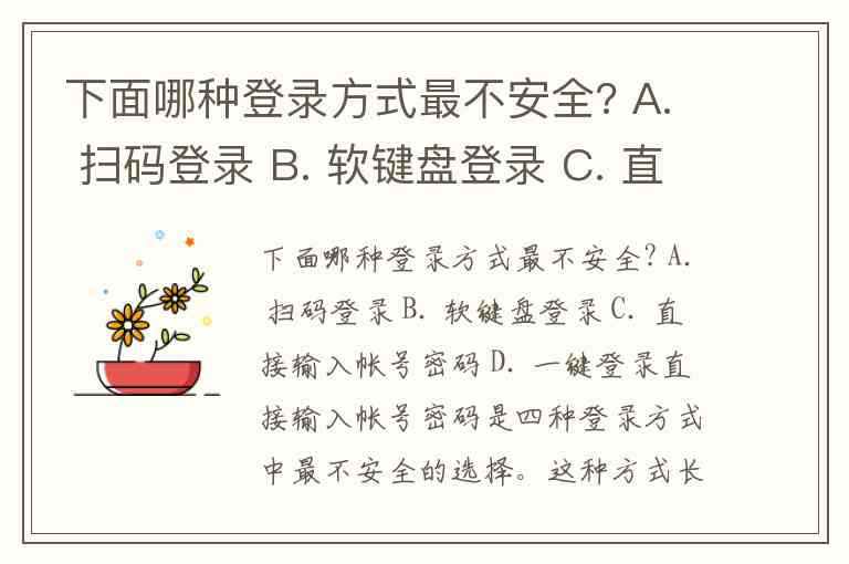 下面哪种登录方式最不安全? A. 扫码登录 B. 软键盘登录 C. 直接输入帐号密码 D. 一键登录