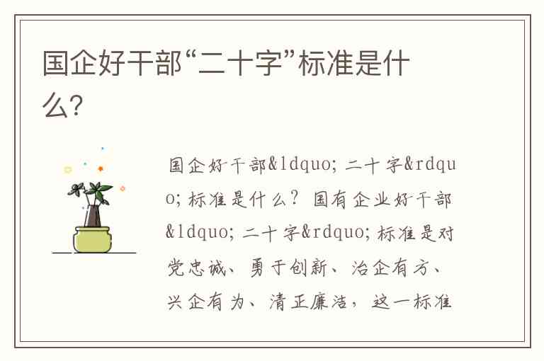 国有企业好干部“二十字”标准是对党忠诚、勇于创新、治企有方、兴企有为、清正廉洁,这一标准由习近平总书记在全国国有企业党的建设工作会议上提出,是针对国企领导人员的专项要求。它与2013年全国组织工作会议上提出的通用好干部标准(信念坚定、为民服务、勤政务实、敢于担当、清正廉洁)既一脉相承,又体现了国企特色。