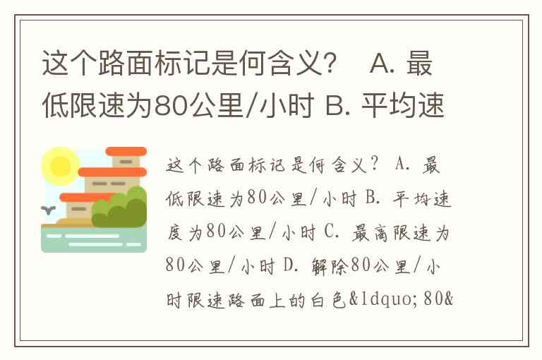 这个路面标记是何含义? A. 最低限速为80公里/小时 B. 平均速度为80公里/小时 C. 最高限速为80公里/小时 D. 解除80公里/小时限速
