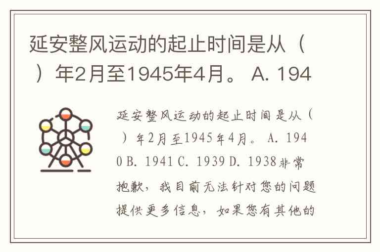 延安整风运动的起止时间是从( )年2月至1945年4月。 A. 1940 B. 1941 C. 1939 D. 1938