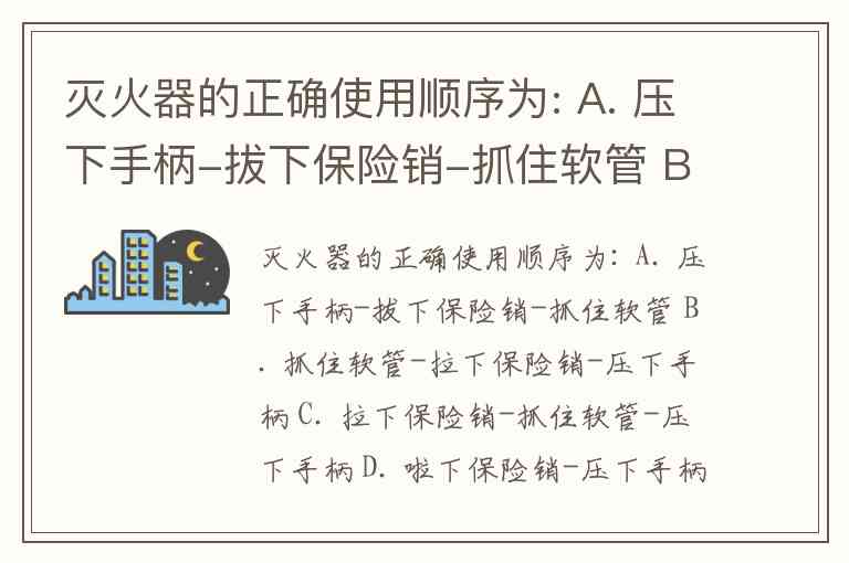 灭火器的正确使用顺序为: A. 压下手柄-拔下保险销-抓住软管 B. 抓住软管-拉下保险销-压下手柄 C. 拉下保险销-抓住软管-压下手柄 D. 啦下保险销-压下手柄-抓住软管