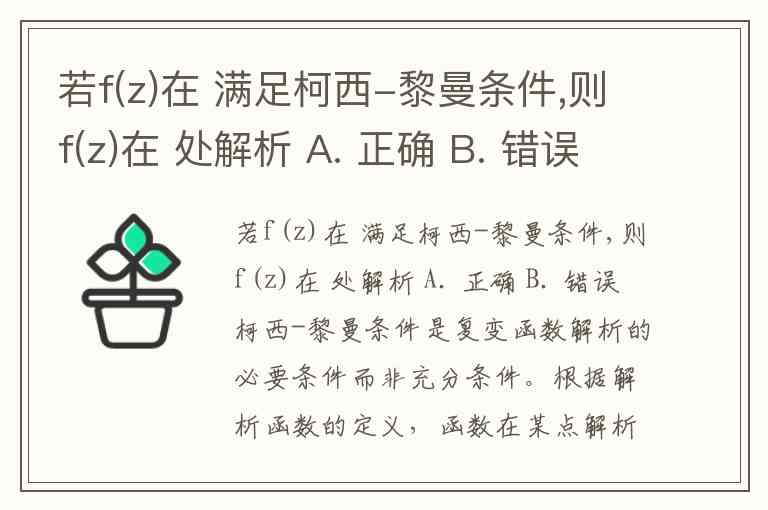综上,柯西-黎曼条件是解析性的必要非充分条件,题目表述错误。答案为B。这一结论揭示了复变函数解析性的严格性:它不仅要求局部导数存在,还要求这种可导性在邻域内具有一致性,这也是解析函数具有无穷次可微性等独特性质的基础。