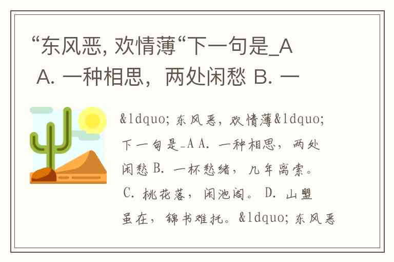 “东风恶, 欢情薄“下一句是_A A. 一种相思,两处闲愁 B. 一杯愁绪,几年离索。 C. 桃花落,闲池阁。 D. 山盟虽在,锦书难托。