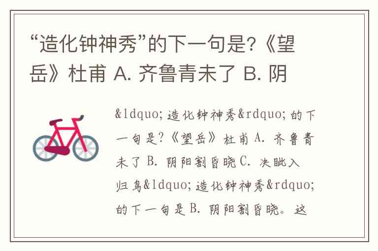 “造化钟神秀”的下一句是?《望岳》杜甫 A. 齐鲁青未了 B. 阴阳割昏晓 C. 决眦入归鸟