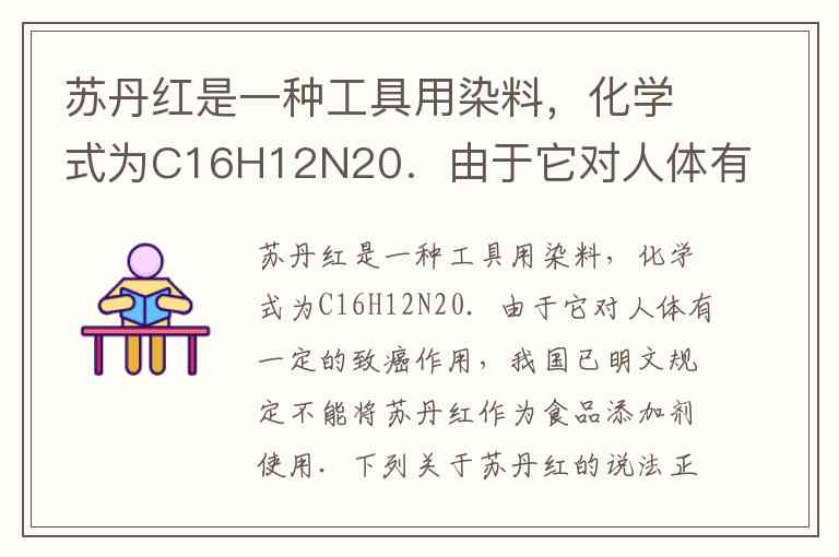 苏丹红是一种具有致癌性的人工合成偶氮染料,常见类型包括苏丹红Ⅰ、Ⅱ、Ⅲ、Ⅳ等,其中苏丹红Ⅰ的化学式为 C₁₆H₁₂N₂O,由碳、氢、氮、氧四种元素组成。题目选项中,B选项“苏丹红由碳、氢、氧、氮四种元素组成”正确,这与化学式中元素组成的分析完全一致。