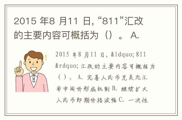 2015 年8 月11 日, “811”汇改的主要内容可概括为()。 A. 完善人民币兑美元汇率中间价形成机制 B. 继续扩大人民币即期价格波幅 C. 一次性释放人民币贬值压力 D. 增强人民币双向波动